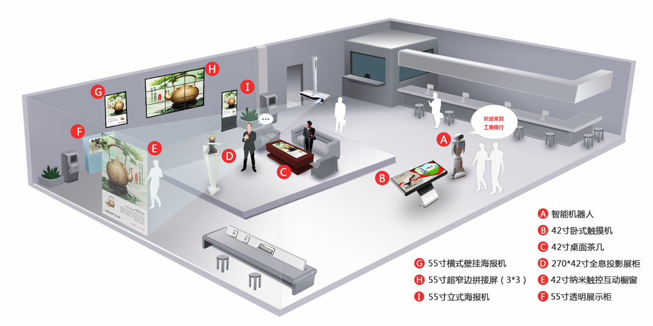 將網(wǎng)點(diǎn)內(nèi)的各種設(shè)備進(jìn)行整合,為客戶提供一整套智能化服務(wù),打造全功能、全智能元素的建設(shè)銀行“智能銀行”網(wǎng)點(diǎn)。智慧銀行建設(shè)主要包括智能預(yù)處理、智能排隊(duì)、智能業(yè)務(wù)引導(dǎo)、互動(dòng)桌面、體感互動(dòng)櫥窗、同屏拼接與綜合信息發(fā)送管理平臺(tái)。