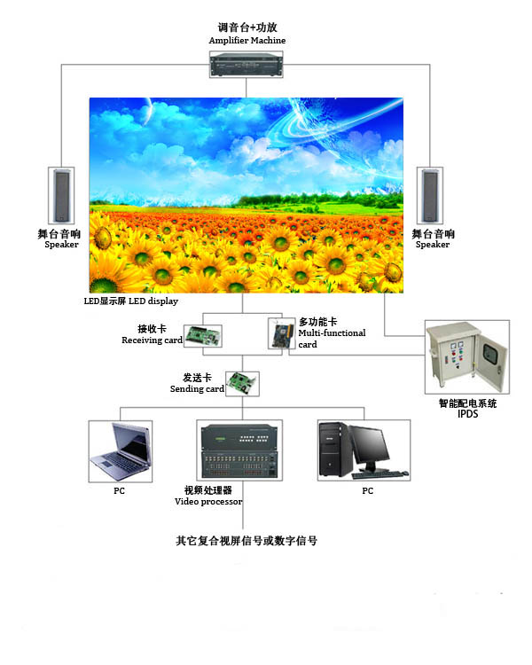 舞臺背景的要求隨著大屏幕LED顯示系統技術的提高,已越來越被編導們看好并運用。大場景大畫面配合歌舞主體以達到渲染現場歡樂、熱烈的效果,使舞臺上下演員與觀眾融入一體,使觀眾身臨其境。、可將一個畫面切分為多個視頻畫面播出 、顯示屏可獨立、結合、任意組合使用播放相關大背景、大屏幕可根據演出需求分區顯示,并可實現圖文的迭加、背景畫面用視頻信號處理器播放或合成同一畫面顯示、可對人物特寫播放、可做文字滾動播放、或插播播放、可水平推移視頻畫面屏風,也可上下升降成為文字、個性視頻畫面、亮化、美化舞臺背景及舞臺地面、通過軟件設計及系統控制來滿足視覺上的效果。 佳惠科技以全新方案解決目前舞臺LED花樣顯示其繁瑣控制及完成更多的特效等難題,可以根據現場擺設的不規則LED點陣,可以根據現場顯示環境效果的需要,通過控制軟件配置,實現變換多樣的顯示效果。