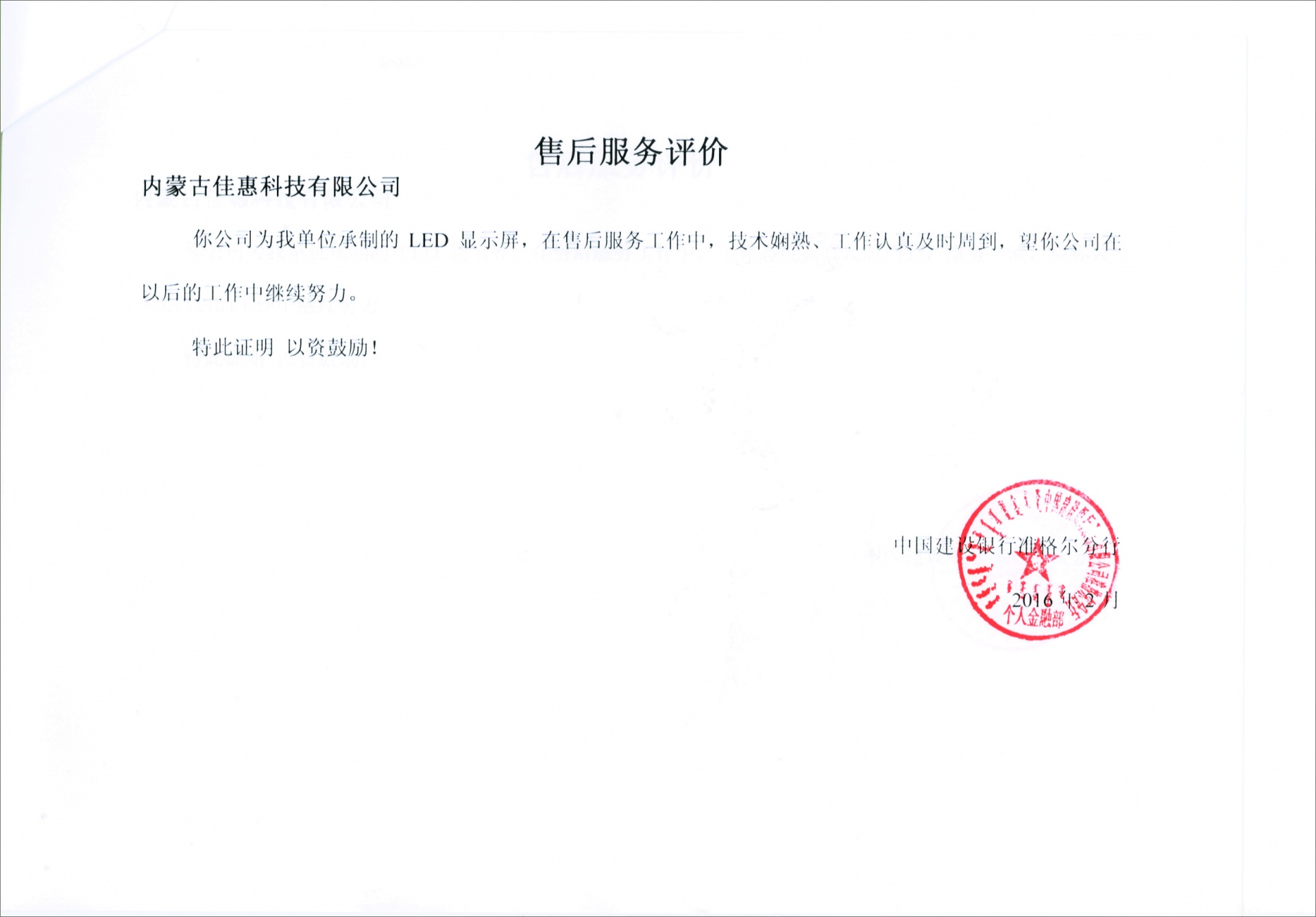 上一條中國建設銀行內蒙古分行鄂爾多斯優質服務證書