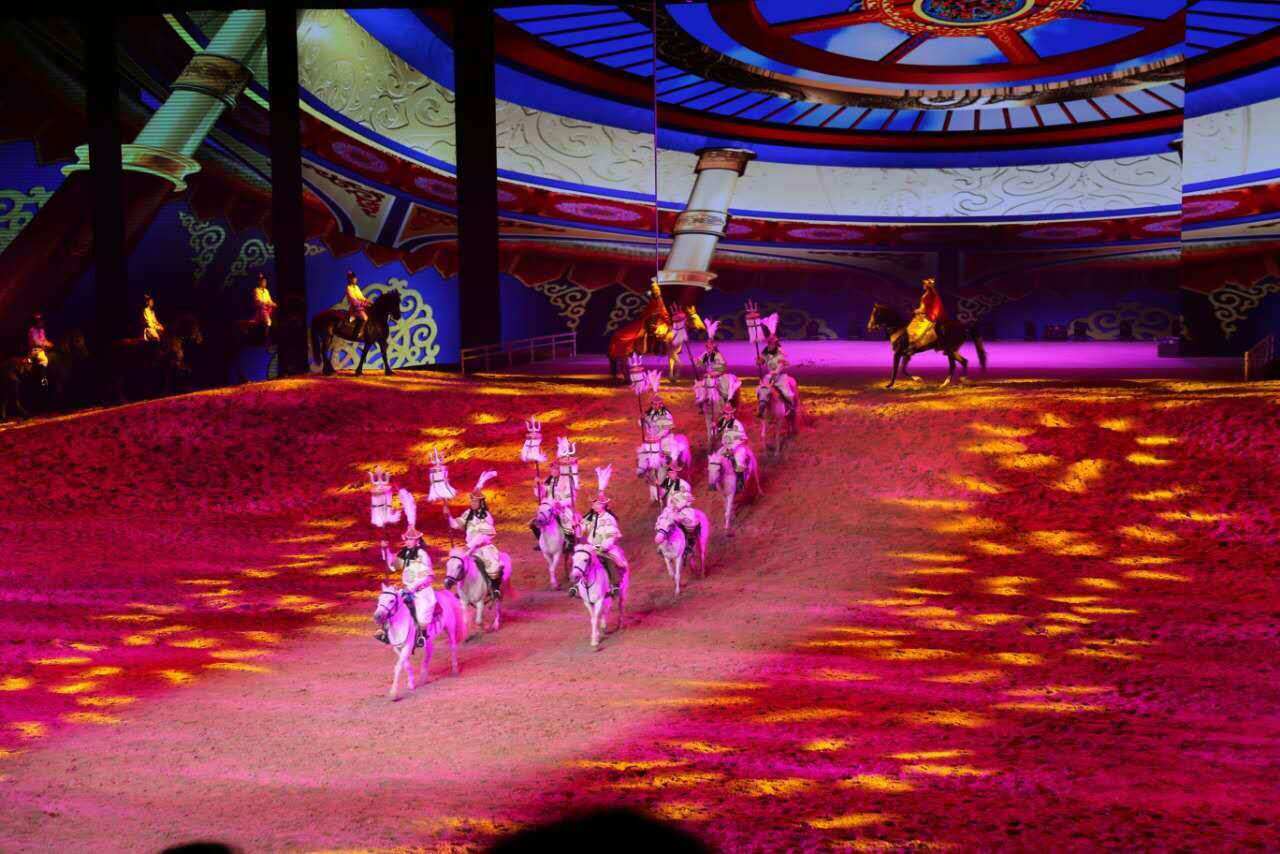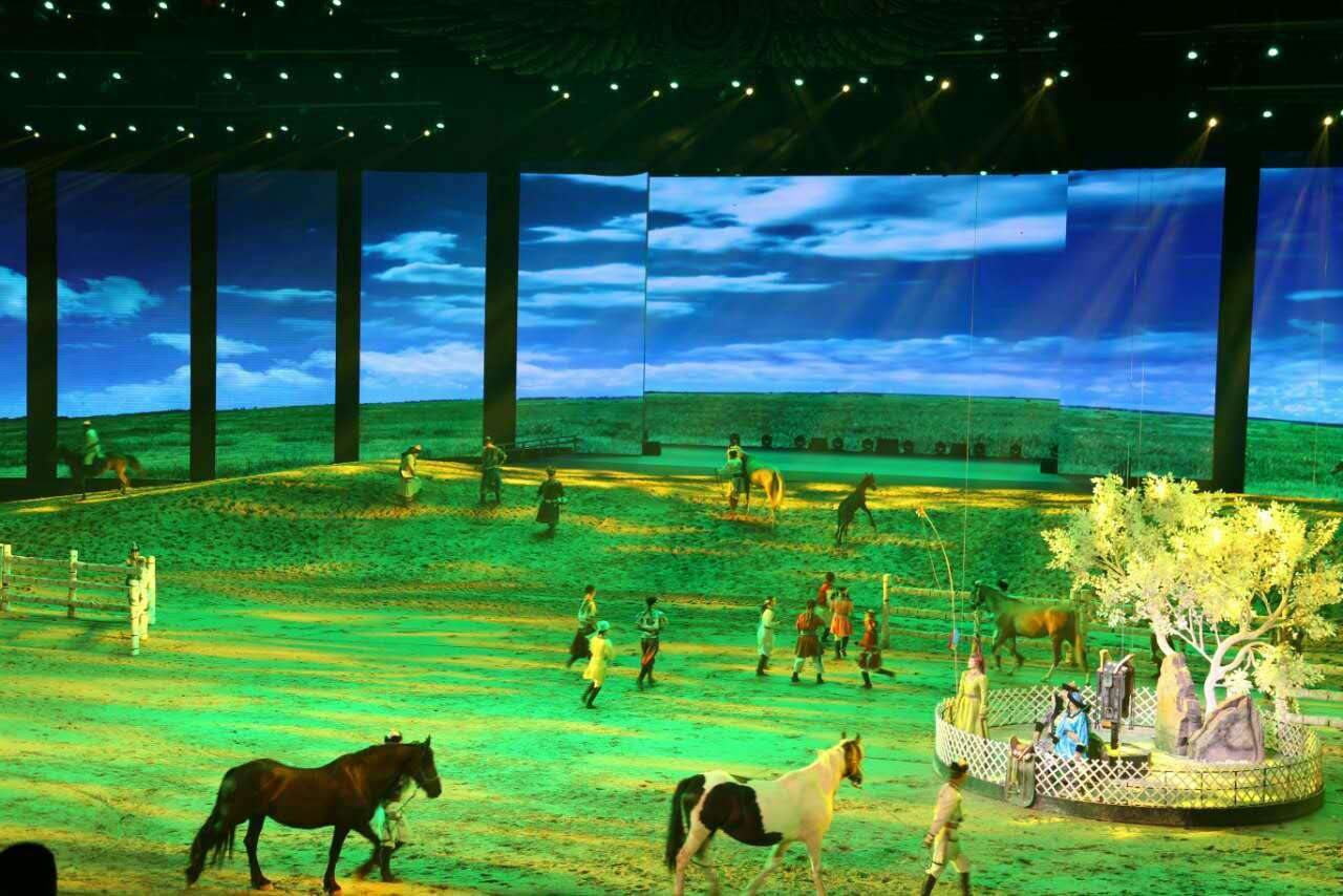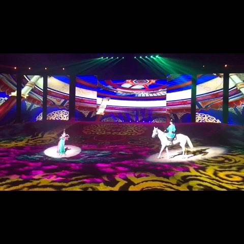 《千古馬頌》劇目演出以蒙古族歌、舞、樂、雜技等藝術元素,融合高科技聲光電及全息影像投影技術,以全新藝術形式演繹了馬背家園的溫情,百駿出征的壯觀,草原兒女的情愫,千古馬頌的絕唱!將人與馬的情緣演繹的淋漓盡致,唯美震撼……我公司在此次演出項目上采用Barco6臺2K40通過拼接及融合的技術實現了非常壯觀的視覺盛宴。